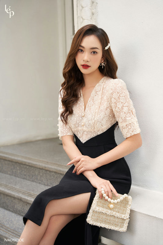 White Lace And Black Midi Dress