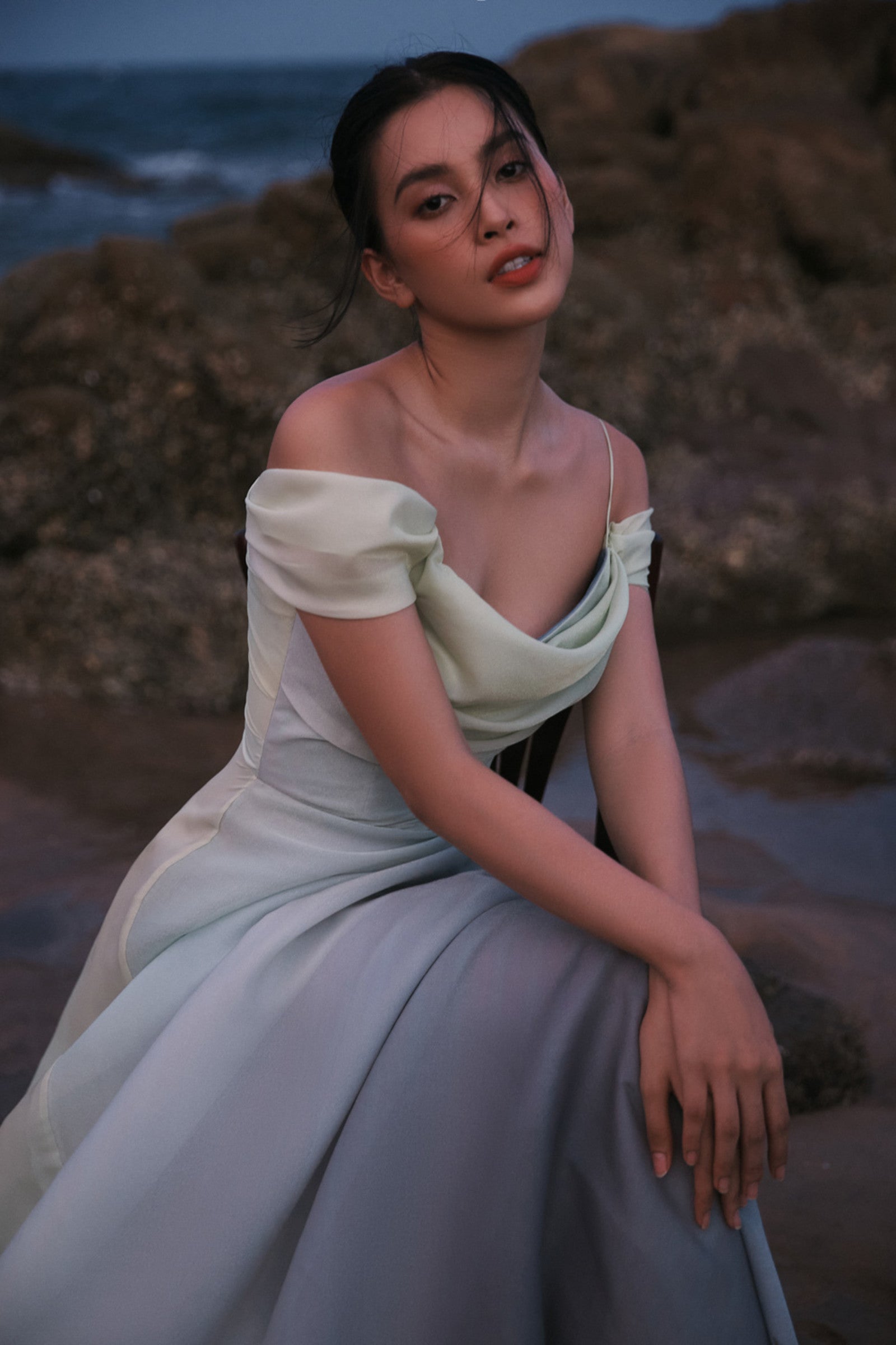 The off-shoulder design of the Olwen Dress adds a touch of sophistication, beautifully showcasing the wearer's feminine curves. The chiffon layering on the upper part adds an ethereal touch, creating an enchanting look. Delicate shoulder straps provide support and add a hint of elegance to the overall design.